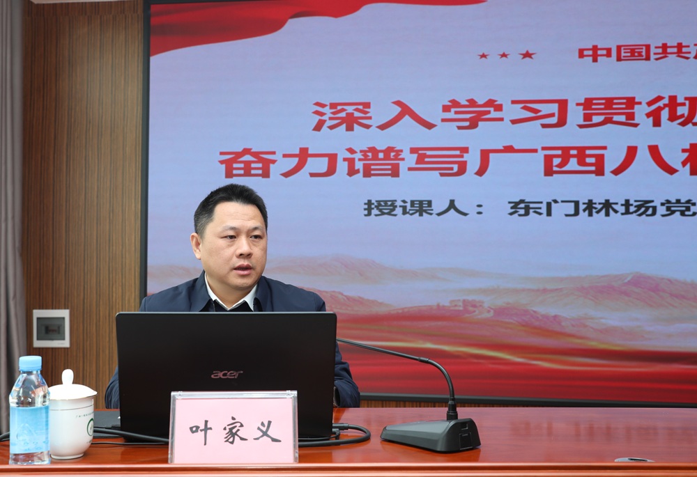 東門林場(chǎng)黨委書記、場(chǎng)長(zhǎng),八桂種苗集團(tuán)董事長(zhǎng)葉家義作宣講
