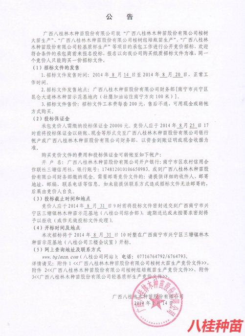 廣西八桂林木種苗股份有限公司就“廣西八桂林木種苗股份有限公司桉樹大苗生產(chǎn)”、“廣西八桂林木種苗股份有限公司桉樹組培瓶苗生產(chǎn)”、“廣西八桂林木種苗股份有限公司輕基質(zhì)杯生產(chǎn)”等項目的承包工作進行公開競價招標(biāo),歡迎符合條件的承包商前來報名投標(biāo),報名以向我公司購買紙質(zhì)招標(biāo)文件為準(zhǔn),同一個競價人只能購買一份招標(biāo)文件。